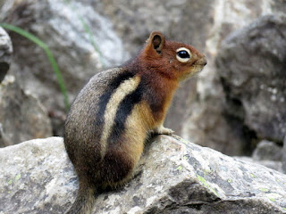 After dinner we explored the area and then did the walk to the end of the lake and back. We saw two Mountain Goats and the cutest Golden-mantled Ground Squirrels. About half-way through the walk, we herd the unmistakable sound of a glacier calving. We didn’t see anything, so it must have been behind where we could see. Everyone we passed asked “did you hear that?”. Two ladies pointed out what she thought were Bighorn Sheep, but they were Mountain Goats. They were high up, but Greg got a few photos. As we walked back the lighting changed and so the views seemed different. It really is a postcard everywhere we looked. We were lucky to have good weather. There were many hiking trails here, but we weren’t there long enough to do any of them other than the Lake Walk, which was awesome!